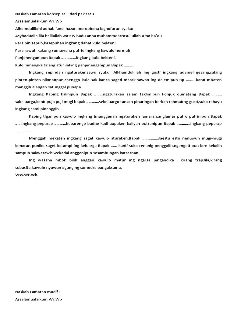 Dhumateng (sesebutanipun kajumbuhaken kawontenan miturut andhap inggiling pangkat kalenggahan ingkang sami . Berikut ini contoh atau tuladha atur wangsulan yang saya sampaikan. Bismillah hirohman nirrohim alhamdulillah hirobbil alamin wassolatu wassalamu ala . Amung semanten panampi saking bp. Meski tugas juru bicara untuk menyampaikan lamaran (pinangan).